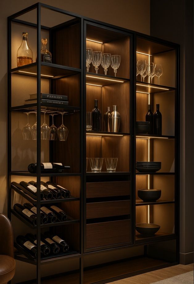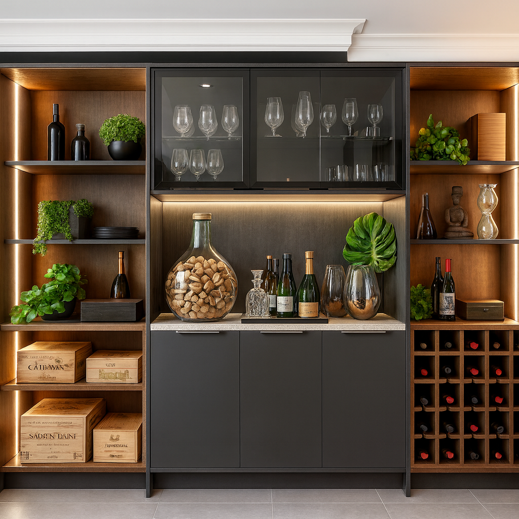 Uma cristaleira planejada é um móvel feito sob medida para o seu ambiente, pensado para guardar e exibir taças, copos, bebidas e objetos decorativos com elegância. Diferente dos móveis prontos, ela é projetada especialmente para o seu espaço, garantindo encaixe perfeito, funcionalidade e design exclusivo.